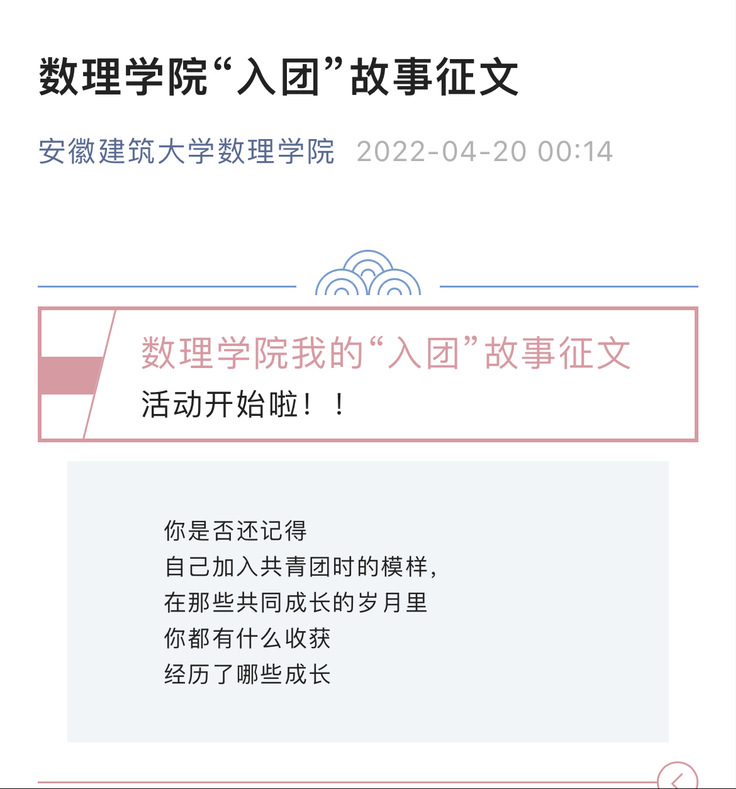 为引导广大团员青年增强共青团员的先进性和荣誉感。数理学院在微信公众号上开展以“回忆入团故事”为主题的征文活动。此次征稿活动旨在广大青年团员从团的百年伟大奋斗历程中汲取智慧和力量,凝聚实现中华民族伟大复兴的青春力量,展示团员青年的精神风貌和青春活力,弘扬五四精神。