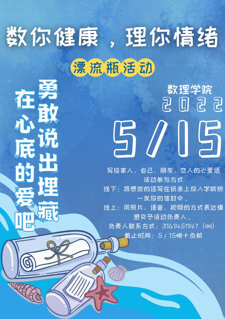 本网讯 为促进大学生心理健康成长,拉近学生之间心与心的距离,根据学校第十八届心理建康月活动安排,5月15日,数理学院开展"数你健康,理你情绪"漂流瓶主题活动,勇敢说出藏在心中的爱。