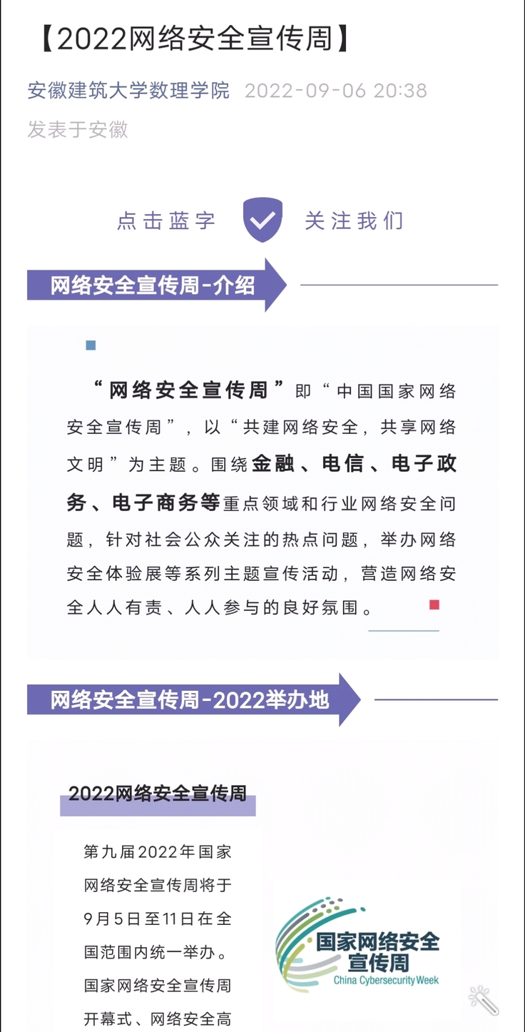 本网讯 2022年9月5日至11日为第九届国家网络安全宣传周,为推动宣传国家网络安全工作深入开展,增强广大师生的网络安全意识和防护能力,9月6-10日,数理学院通过线上线下相结合的方式开展网络安全的宣传活动。