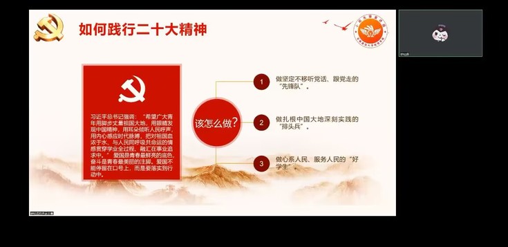 10月24日,数理学院“小欧”先锋宣讲团在线上开展“青春献礼二十大,奋进担当向未来”主题宣讲活动。先锋宣讲团成员徐明雅、羿宇航、何静、王欣芮、徐明雅分别向同学们讲述一大到二十大以来优秀党员的榜样模范事迹,号召同学们向这些优秀党员学习,最后宣讲团成员与同学们就青年学子该如何做才能真正践行二十大精神展开讨论。