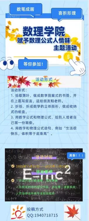 活动采取线下制作与线上征集相结合的方式开展。同学们通过新媒体平台展示自己对数理公式蕴含人情味的理解,表达出对生活的热爱与对未来的美好憧憬。同学们小心翼翼地拾取落叶,做成数学图案式的书签,并在上面写留言,一份愿望、一份祝福,赠与朋友和老师;不少同学用数学和物理公式造句,传递心灵寄语,进行情感交流,展示理工学生的那一丝丝浪漫。