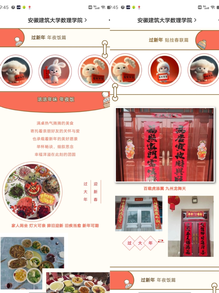 大年初一,同学们通过录制新春祝福视频,表达出对新年的美好期望,数理学院易班平台面向全院同学开展年味照片征集活动,通过贴春联、写福字、做手工等照片向大家展现不同地方的不同风俗习惯,每一张照片都表达出了大家对于辞旧迎新,家人团聚的欢乐,同时也传递出大家对新一年美好生活的向往。