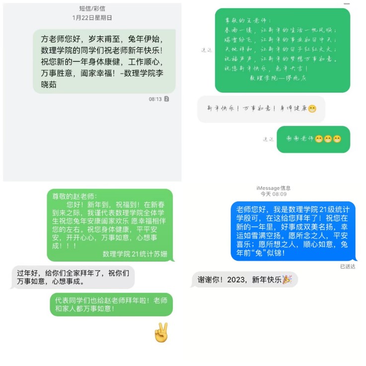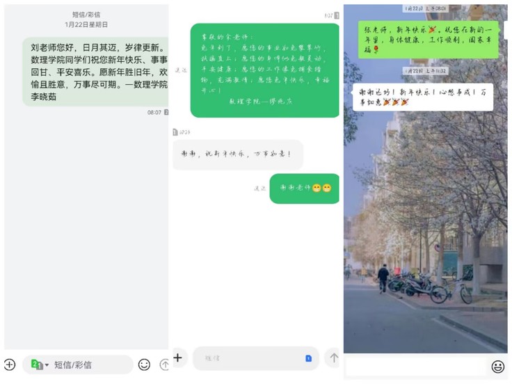 除夕夜,同学们通过QQ、微信、短信等方式向学院领导、学业导师、辅导员等在教育工作一线辛勤付出的老师们送上节日的祝福,通过诚挚的祝福,表达对老师一年辛勤培育的感谢,进一步增进师生之间的感情。