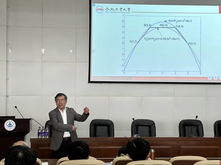本网讯 2023年5月24日下午,应数理学院邀请,合肥工业大学数学学院二级教授、博导檀结庆教授做客“易海大讲堂”,在图书馆五楼报告厅为师生作“数值分析双语教与学的几点思考”为主题的报告。校党委常委、副校长闵杰主持了报告,近100名师生参加。