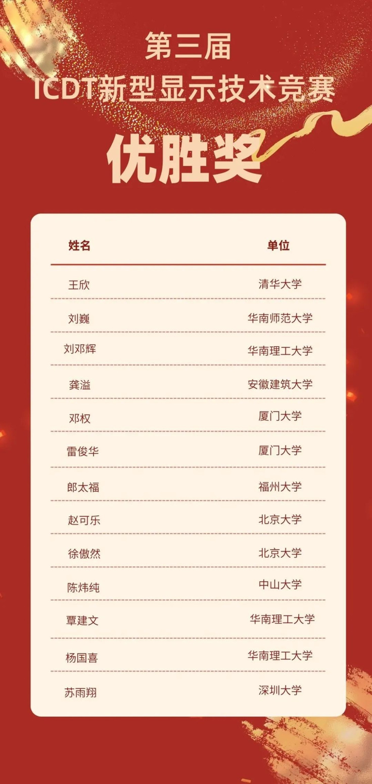 ICDT新型显示技术竞赛每年由SID China主办,面向全国(含港澳台)科研院所博士生、硕士生、本科生。第三届竞赛于3月底公布赛题,并于6月底提交了初赛内容。围绕“显示算法”、“显示硬特性—TFT电路和仿真”以及“开放赛题”3个显示相关试题展开。竞赛旨在激励参赛团队深入探索显示技术的前沿领域,发挥个人科研兴趣与创新能力,提出具有实际应用价值的解决方案。