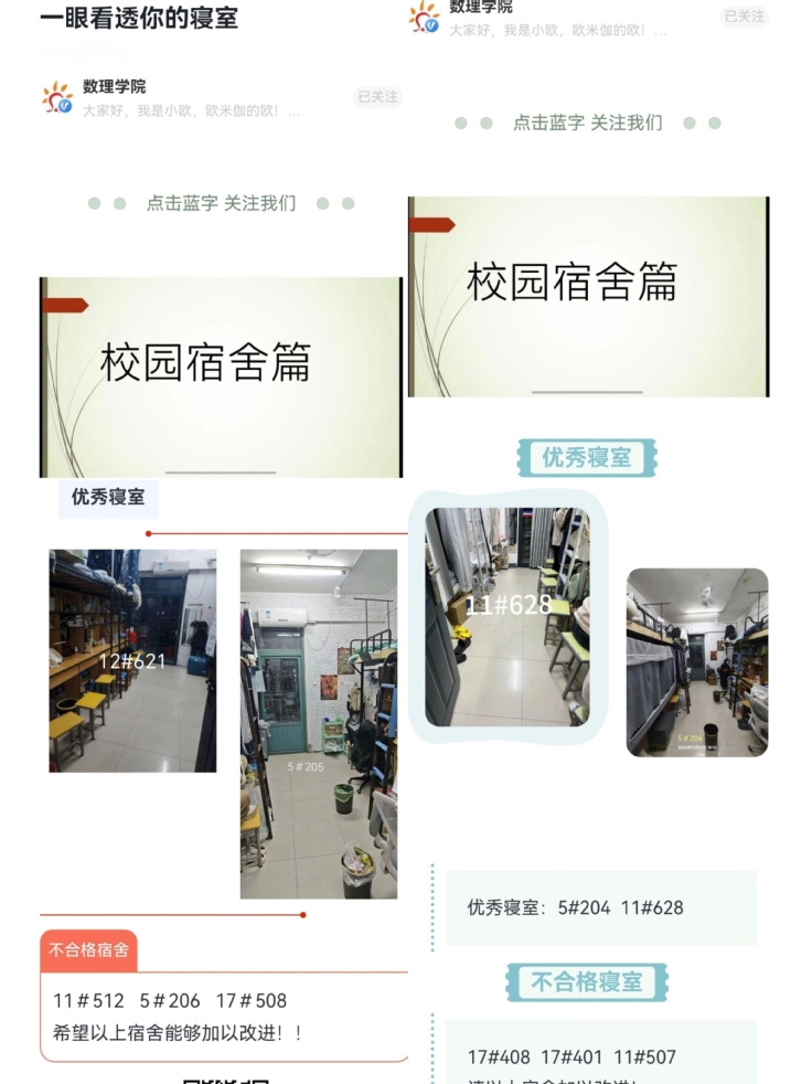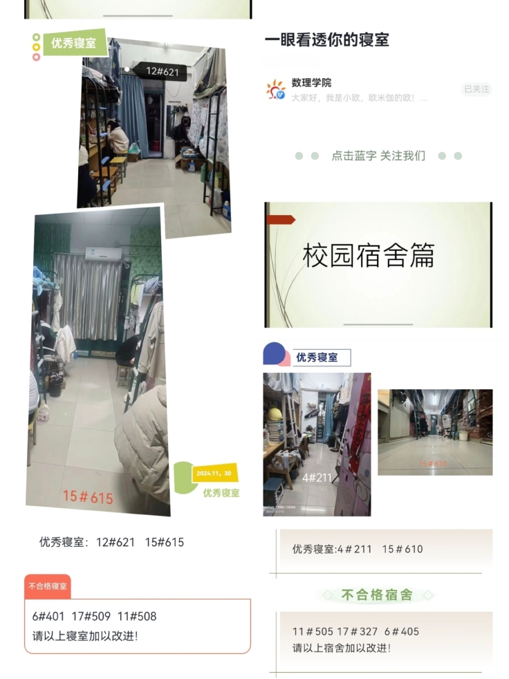 寝室是大学生温暖的家,是同学们休息、放松的地方,又是寝室成员交流思想、培养情感的重要场所。从10月开始,数理学院每周开展宿舍安全大检查,检查的重点内容为宿舍是否存在乱拉电线、违规使用大功率电器现象、是否存在室内抽烟、酗酒现象并在学院微信公众号寝室专栏“一眼看透你寝室”上对优秀寝室进行表彰、对较差寝室加以提醒,通过全面检查进一步增强了学生的卫生意识和对健康生活方式的重视,形成学生个人卫生得体整洁、个人区域经常整理、公共区域共同清理的良好氛围。