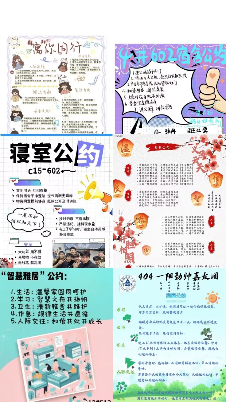 活动前期,学院通过班级群、宣传栏等多种渠道进行了广泛宣传,详细介绍了寝室公约活动的目的、意义及参与方式。学院各年级寝室同学积极响应,纷纷围绕作息时间、卫生值日、学习互助、财物管理、人际交往等方面展开深入讨论,共同制定出专属的寝室公约。这些公约内容丰富多样,既有对良好生活习惯的约定,如按时作息、保持室内整洁,也有对团结友爱、互相尊重的承诺,也有遇到矛盾及时沟通、共同参与寝室活动等。在公约海报制定过程中,同学们充分发挥创意,配以生动有趣的插图和温馨励志的话语,为公约增添了独特的文化内涵,彰显了宿舍的个性和精神面貌,生动形象地展现了室友间的互动与默契。本次活动有11个寝室参加评选,学院评审小组,对各寝室提交的公约作品进行评选。最终评选出了6间优秀寝室公约。
