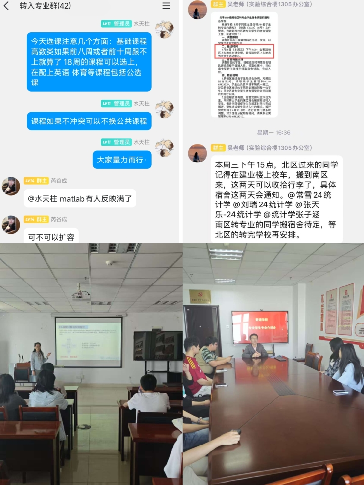 学院高度重视转专业学生的服务和管理工作,提前谋划,召开辅导员会议对相关活动进行安排布置,要求相关辅导员牢牢树立服务意识,结合专业特色细化工作。辅导员通过全程参加转专业工作面试等各环节、创建转专业学生交流群以及与转出学院辅导员对接联系,及早全面了解学生基本情况。在群内,辅导员、班长、学习委员化身“贴心导师”,耐心解答同学们在课程衔接、学习方法、生活适应等方面的各类问题。经过为期两周的过渡期,同学们对新专业的学习生活节奏有了清晰认知和归属感。同时,学院各专业系召开专业介绍会,从课程设置、培养目标到就业方向,全方位帮助同学们构建对新专业的系统认知。