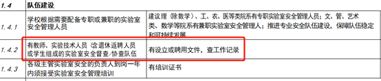 别着急,《高等学校实验室安全检查项目表(2020)》中有答案:学校层面配备专或兼职的实验室安全管理人员,可以由教师、实验技术人员(含退休返聘人员)或学生组成实验室安全督查/协查队伍。