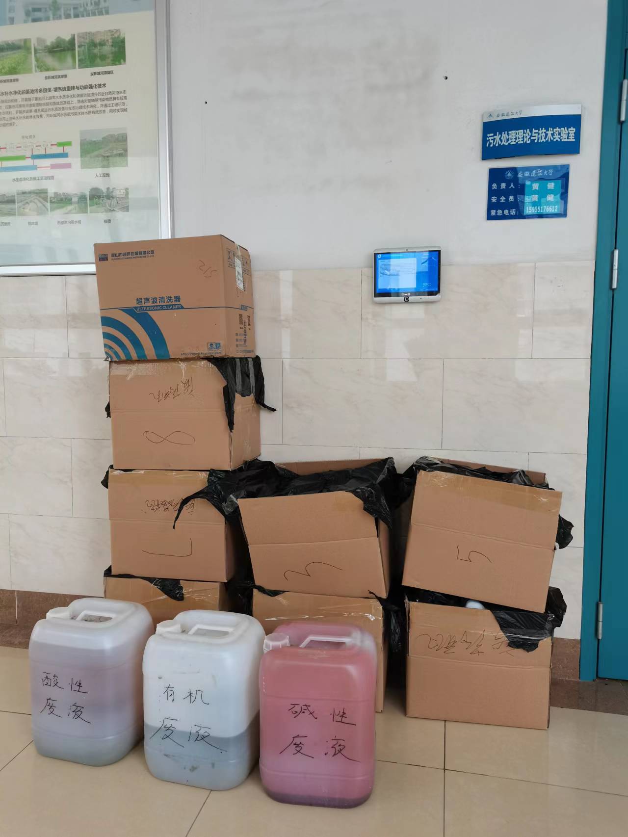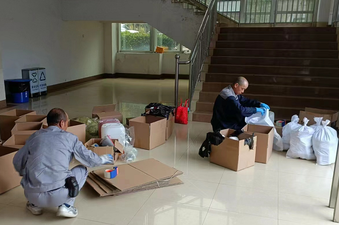 本次实验室化学品废弃物回收处置从收储、申报到分装、清运历时两周,共处置环境与能源工程学院、材料与化学工程学院等实验室收集的废液、废固、过期化学品、试剂空瓶等废弃物1.579吨。