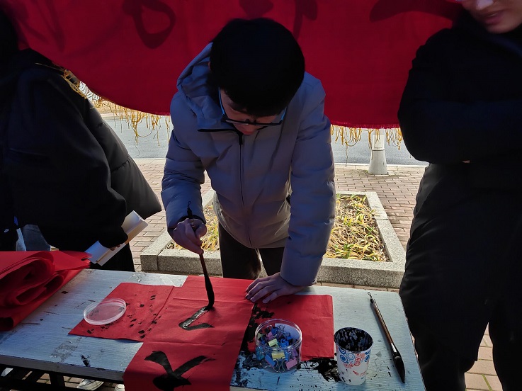 趁着冬日的暖阳,工作人员提前支好桌椅、铺上红纸、摆上笔墨,为学子免费书写并赠送春联和福字。活动一开始就引来了同学们的热情参与,在活动现场,大家既可以选择写好的春联,也可以让土木学院的“书法家”们现场为自己“量身定制”。怀着对书法和春联的喜爱,许多同学、老师、甚至是路过的人们都热情参与,他们有的将赠送的对联贴在寝室、家中的门边,有的将春联转送他人。活动中,一些同学们为表达对老师们的感激与尊敬,亲手提笔泼墨,将自己美好的祝愿寄托在一幅幅小小的春联中。这也将老师与同学们紧密的联系起来,使冬日的校园变得暖意融融。也为营建校园气氛,创建师生互联的良好环境起到了良好作用。(图/文:王月竹 江涛 审稿:胡燕青)