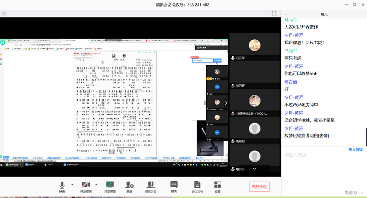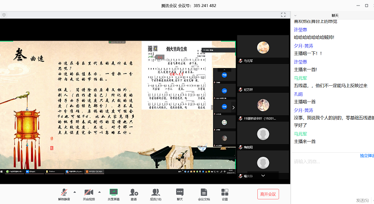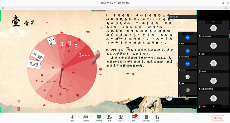 此次活动由衿易社成员马元军和杨瑞担任主讲。杨瑞介绍了民乐中关于音符的知识,详细介绍了音符的组成、音长、节拍等基本乐理内容。马元军以《烟火里的尘埃》一曲为例,讲述了节拍、曲速等知识。活动过程中,同学们在讨论区积极交流互动。最后,两位主讲人以《故梦》一曲进行了示范教学,在线上给同学们带来了一段精彩的民乐演奏,同学们纷纷表示被民乐的魅力所撼动。