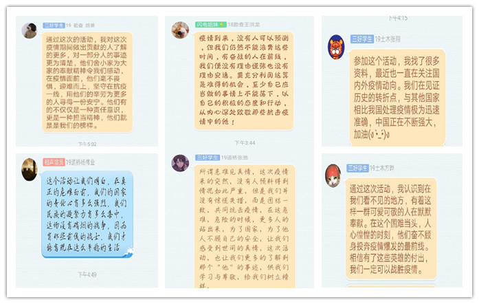 本次“弘扬雷锋精神,寻找抗击疫情的他”线上活动弘扬了在抗击疫情中体现的无私奉献、攻坚克难、众志成城的新时代雷锋精神,有助于帮助同学们树立正确的世界观、人生观、价值观,推动学雷锋活动常态化、制度化,凝聚中华民族伟大复兴的精神力量。(图/文:王月竹 王辰阳;审核:胡燕青 )