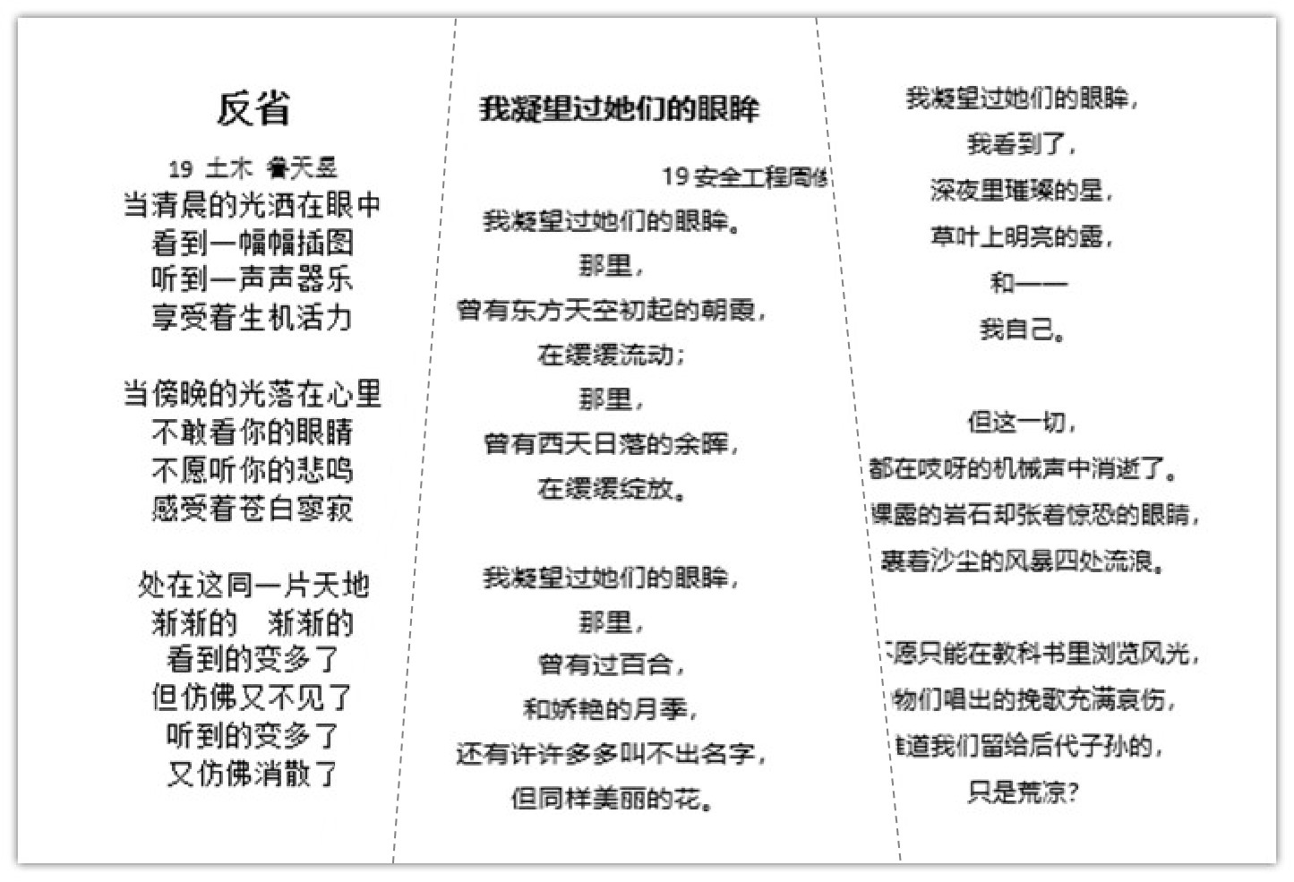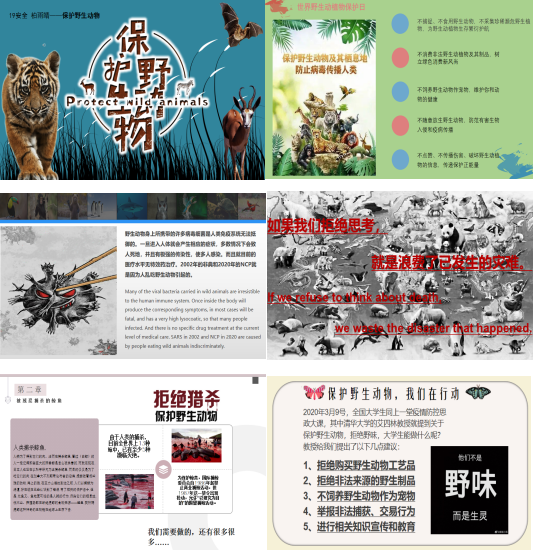 此次新冠肺炎疫情,再次警醒人们要禁食禁售野生动物,我们要树立“保护野生动物、建立生命共同体、共享同一个地球”的意识。前不久在全国大大学生同上一堂疫情防控思政大课中,冯秀军教授就保护野生动物我们大学生可以做些什么进行了阐述。学习之后,同学们也开始了保护野生动物的行动。自3月16日活动开启后,同学们踊跃报名参加。宣传的形式多种多样,白啸野、柏雨晴、吴靓等同学用PPT介绍着世界上濒危的动物的生活现状,普及了关于野味的定义,剖析了野生动物减少的原因;石梓钰、胡莹同学用充满冲击力的颜色与铿锵有力的文字绘制出一幅幅海报。有些文思泉涌的同学,以笔为剑,用一篇篇动人的诗歌,倾诉着自己的情绪与保护野生动物的决心。