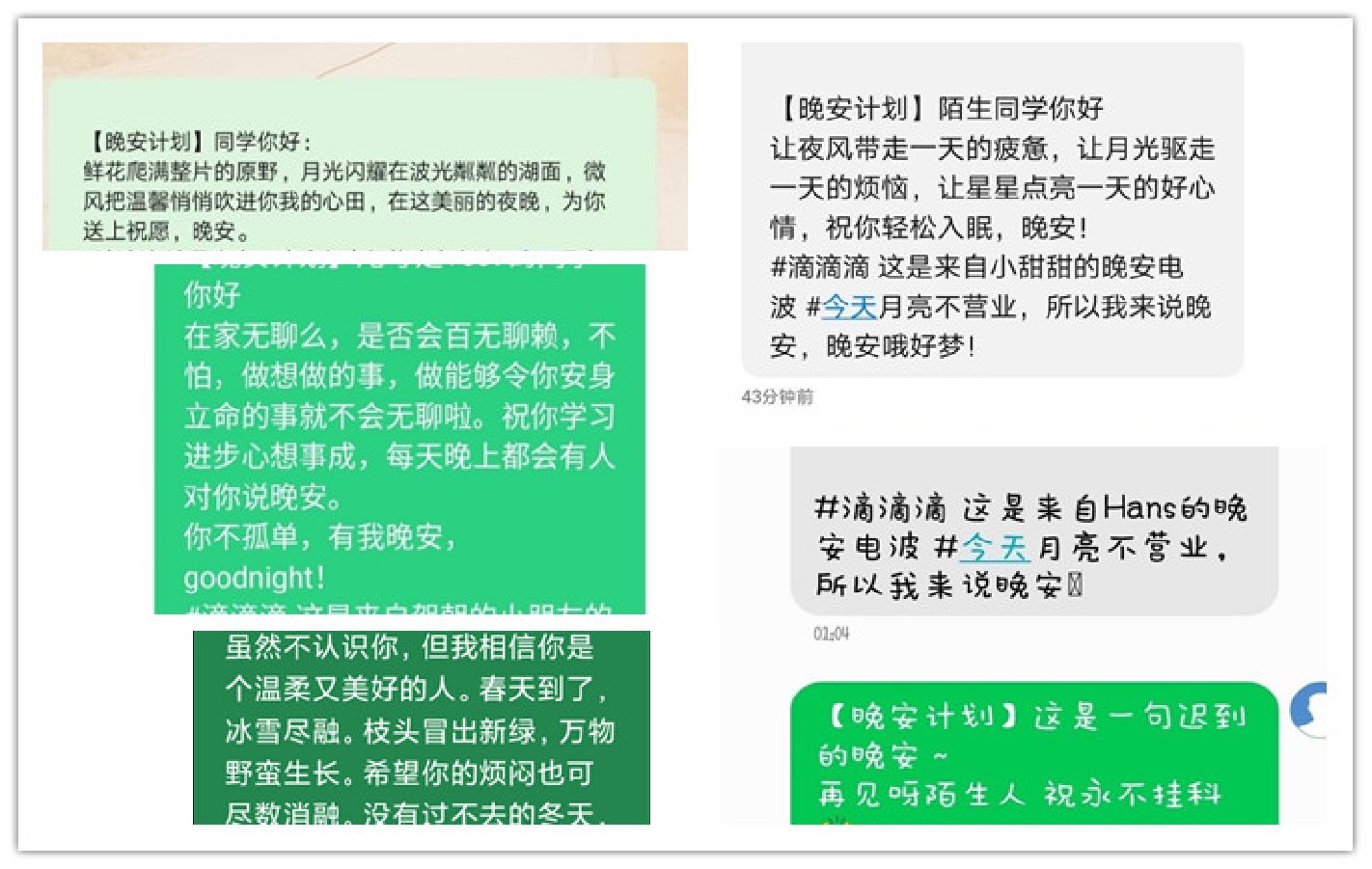 活动刚进入宣传阶段就受到了同学们的欢迎,纷纷踊跃地报名参与。同学们向指定账号发送了自己的电话号码工作人员将号码随机配对。当夜幕降临,参与活动的同学们以匿名或实名的方式向手机另一端的同学以短信的形式或分享自己的日常,或分享自己的心情,或倾诉自己的烦恼,又或向对方传递温暖与正能量。文字中蕴含着温柔的力量:“希望这个世界变得更加温柔吧,更希望病毒统统走开!今天下雨没有月亮,所以由我来说晚安噢,晚安呀!”“每一束微小的光,都可以镇压黑暗的侵袭,一起期待春暖花开吧!”一条条短信在这个春天温暖着同学们的夜晚,抚平同学们的焦虑与不安。