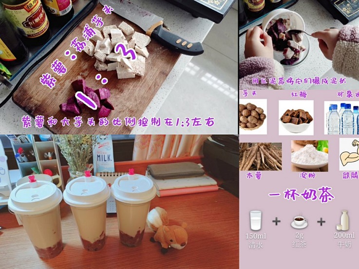在外求学的学子常常想念“妈妈的味道”,居家学习期间的同学们有了更多的时间陪伴父母,也有了更多时间分担家务。本次活动深受同学们的欢迎,参赛者提交的菜品各式各样,黄焖鸡、臭鳜鱼、家常豆腐、红烧肉、奶茶甜品等应有尽有,每一个作品都PPT或者Vlog等形式详细介绍了所用食材、制作工序及其营养价值,准备的认真又有趣。最终,19地质的陈婷玉同学制作的“芋泥波波茶”Vlog通过活泼生动的拍摄手法以及细心全面的介绍获得本次活动的一等奖,她表示,希望一杯暖暖甜甜的茶能让辛苦工作的妈妈放松下来,感受生活的美好。