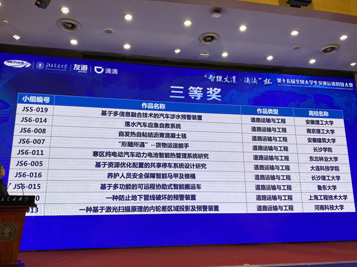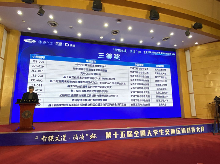 本网讯 2020年11月28-29日,“智联友道·滴滴杯”第十五届全国大学生交通运输科技大赛在北京交通大学举行。由于疫情原因,本次决赛答辩采取“线上答辩、线下评审”方式进行。我院2组进入决赛的学生作品均荣获三等奖。