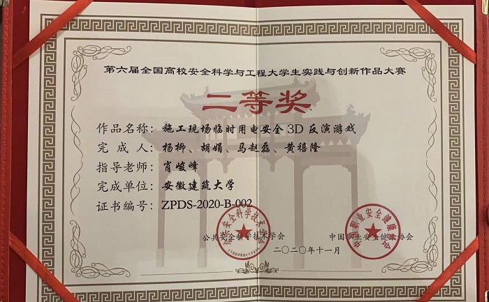 我校教师肖峻峰教授指导,18安全学生杨柳、胡娟、马赵磊、黄禧隆共同完成的作品“施工现场临时用电安全3D反演游戏”在本次比赛中荣获二等奖。
