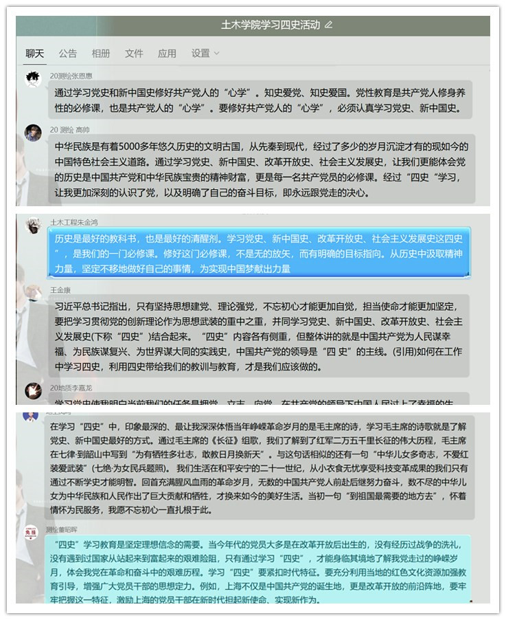 同学们在线上通过观看视频、阅读相关资料书籍的方式学习“四史”。在本次活动中土木学子们进一步领悟了爱党爱国、爱校荣校的精神,纷纷写下了自己的所感所得。同学们表示自己深切的体会中国共产党在革命奋斗中的艰难历程,深刻的了解中国共产党为了实现中华民族伟大复兴的中国梦的历史使命。学习“四史”,帮助同学们建立正确的世界观、人生观、价值观,成为有信仰、有理想,有担当的时代青年。
