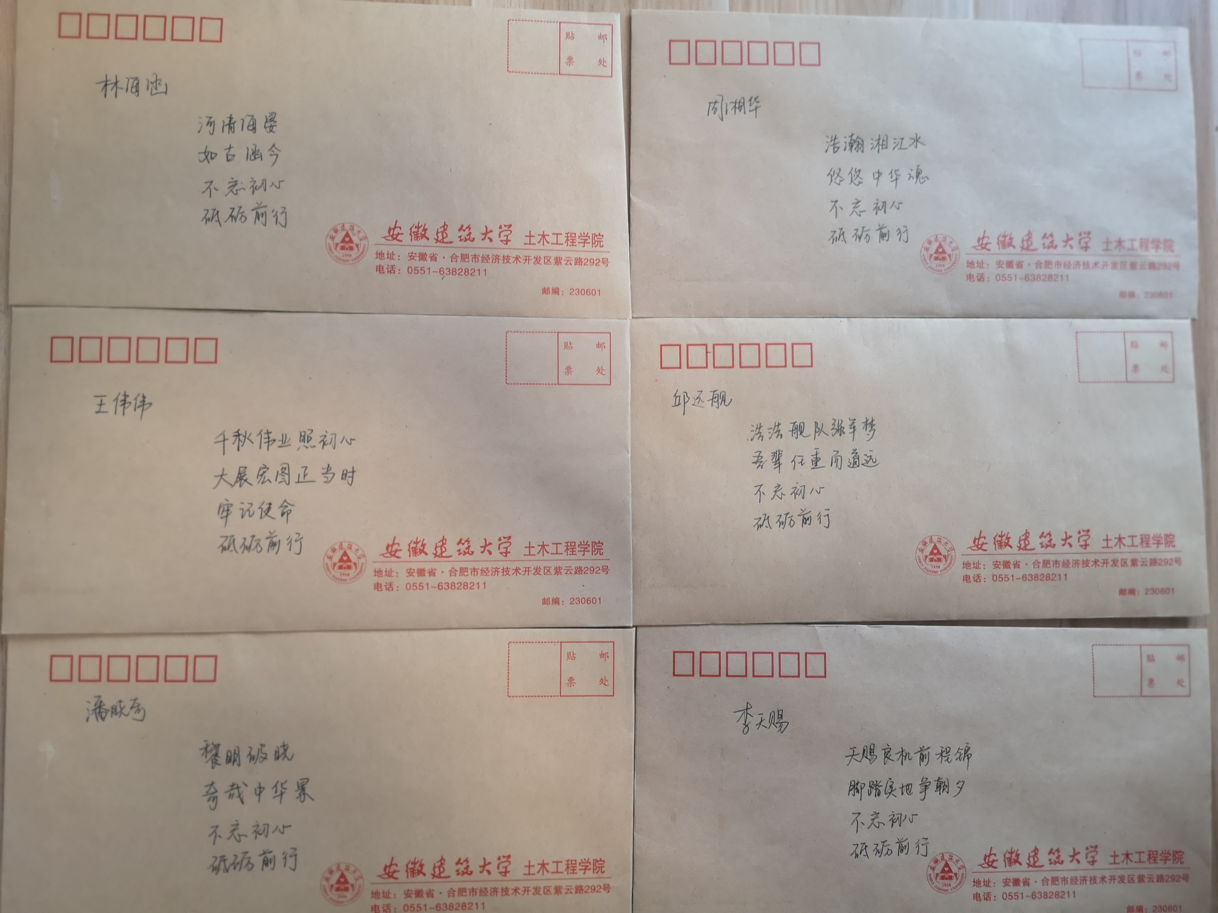 “以汝之名,书写寄语”,是将发展对象的名字融入到寄语之中,以提醒他们不忘初心,端正入党动机,激励他们将“小我”融入“大我”,不断增强思想自觉和行动自觉。安全工程学生党支部、测绘工程学生党支部等支部充分利用发展对象政审契机,支部书记在装有组织外调函的信封上认真书写寄语。例如寄语17安全潘晓奇同学:“黎明破晓,奇哉中华景!不忘初心,砥砺前行!”寄语17安全汪博文:“君子博学于文,青年践之于行。不忘初心,砥砺前行!”寄语17测绘王骈臻:“臻于至善,行于无疆。不忘初心,携手骈进!”寄语17测绘朱安国:“国泰民安,吾辈自强。不忘初心,砥砺前行!”以汝之名,书青春华章!以汝之名,树奋斗形象!