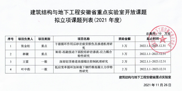 建筑结构与地下工程安徽省重点实验室 2021年度开放课题拟立项课题的通知