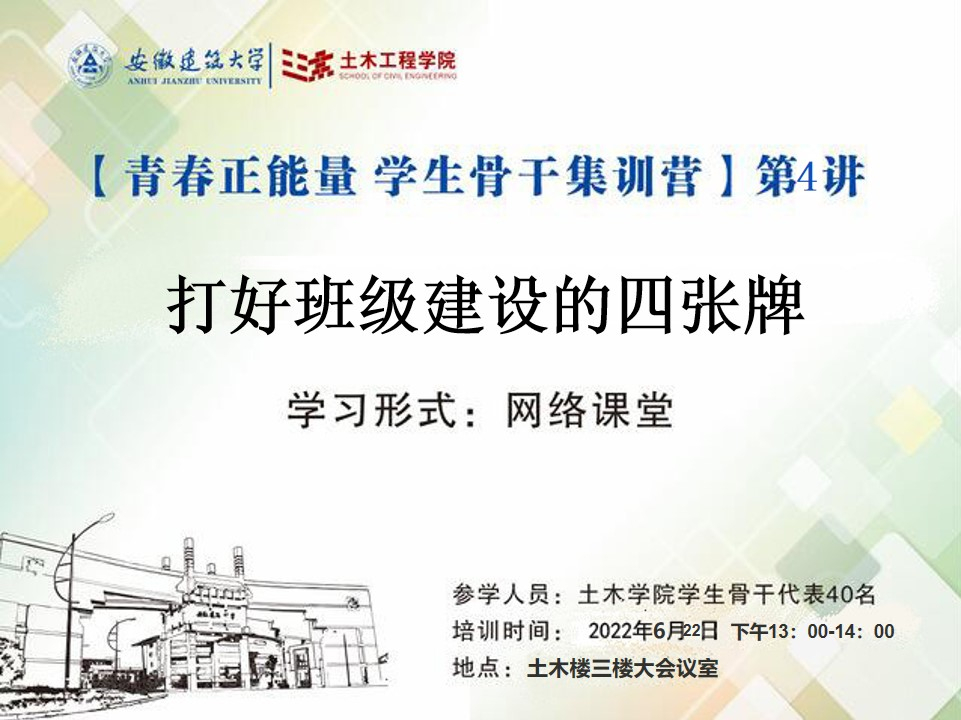编者按:今年是党的二十大召开之年,也是共青团建团100周年,为深入贯彻落实习近平总书记关于青年工作重要论述精神,进一步强化青年学生的思想引领,切实将青年工作抓实、抓细、抓具体、抓出成效,土木学院特推出“青春正能量 学生骨干集训营”专题培训活动,旨在搭建青年学生骨干学习、锻炼、展示平台,通过抓好“关键少数”带动“绝大多数”,教育引导广大学生增强中国特色社会主义道路自信、理论自信、制度自信、文化自信,高扬理想风帆,厚植爱国情怀,把爱国情、强国志、报国行自觉融入到实现中华民族伟大复兴的奋斗中,以一往无前的姿态展现土木学子风采,喜迎党的二十大胜利召开。