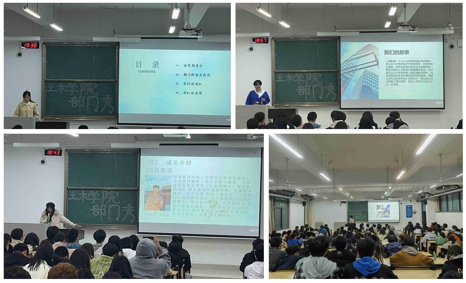 在主持人的热情洋溢的致辞中,活动拉开序幕。来自不同部门的同学PPT或动感影集的形式向大家展示自己部门的基本情况、特色活动以及前景展望。部门秀活动的开展,不仅向大一新生介绍学生会各部门的职责,还增进了同学们之间的交流;活动结束后,同学们纷纷表示对学生活动产生了极大的热情与期待。学生会各部门负责人也表示要积极工作、勇敢担当,努力为同学们做好服务,同时也欢迎每一个热爱求知、奉献的土木学子加入到学生会大家庭!(图/文:王月竹,吕加琦,廖雨欣;审核:王媛)