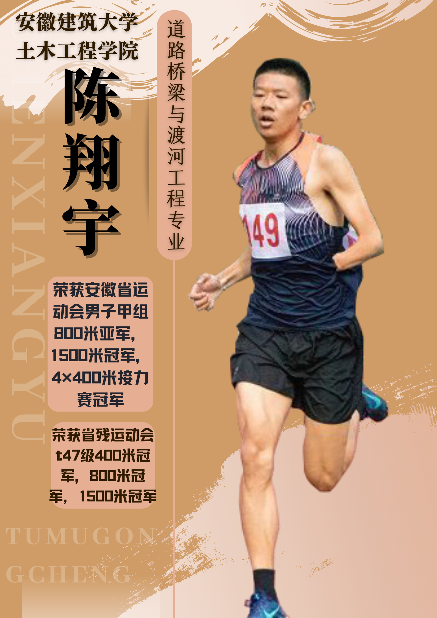 本网讯 喜讯,我校土木工程学院道路桥梁与渡河工程专业的陈翔宇同学在安徽省第八届残疾人运动会上再创佳绩,获得t47级400米,800米以及1500米三项冠军。在此之前,陈翔宇同学刚刚获得安徽省第十五届运动会高校部男子甲组1500米冠军、4×400米接力冠军及800米亚军。