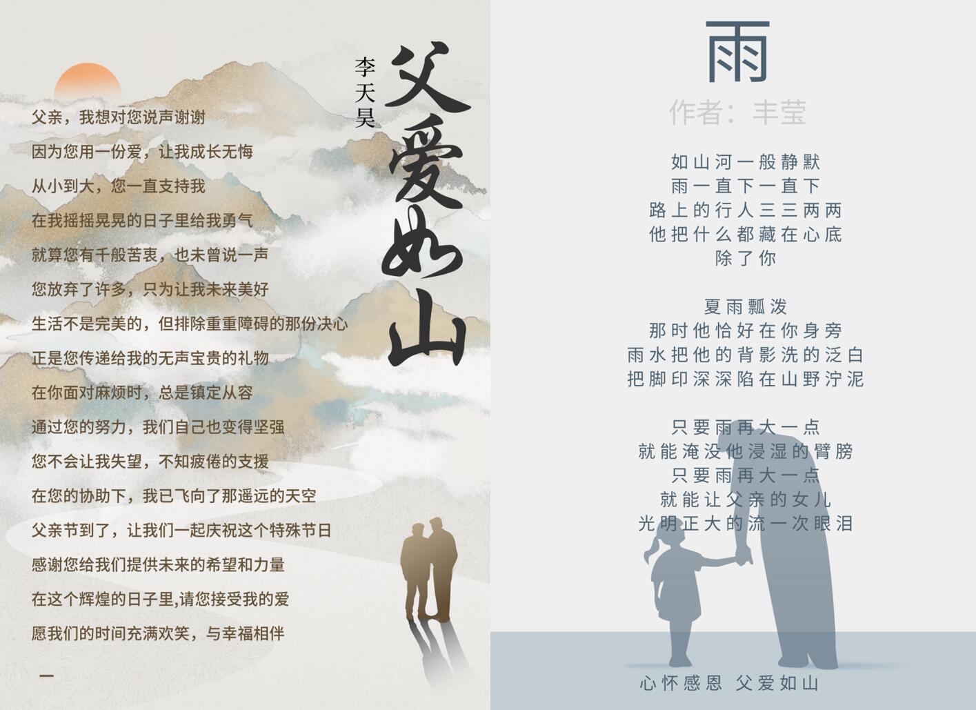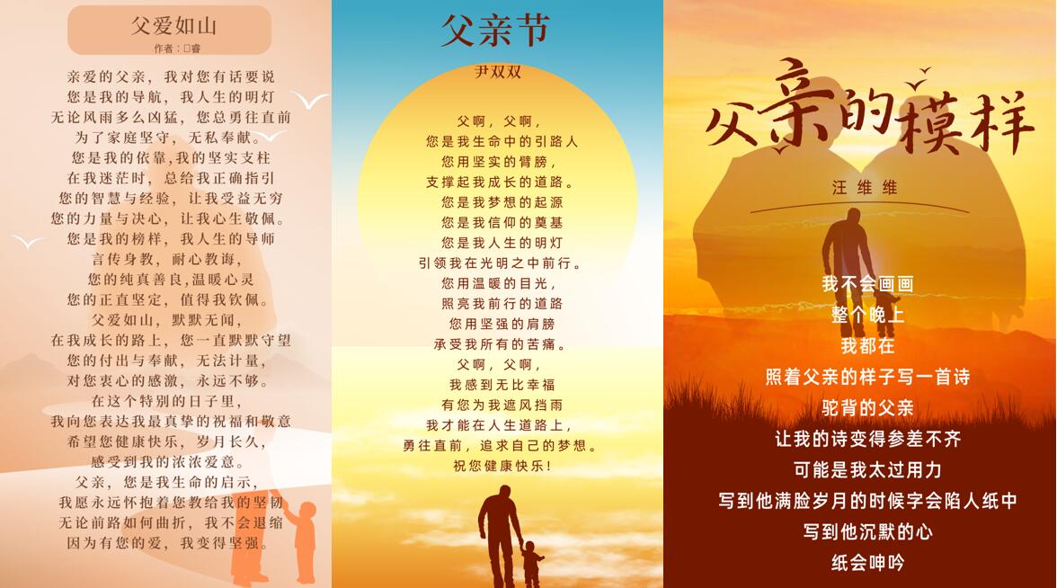 同学们的作品揭示出了父亲与子女之间深厚而独特的亲情,有的感人至深,有的词句优美。李天昊同学创作的《父爱》里写到“从小到大,您一直支持我,在我摇摇晃晃的日子里给我勇气,您放弃了许多,只为让我未来美好”。尹双双同学创作的《父亲》中写到“我感到无比幸福,有您为我遮风挡雨,我才能在人生道路上,勇往直前,追求自己的梦想”。丰莹同学创作的《山》、刘睿同学创作的《父爱如山》等也抒发了对父亲的真挚感激之情。