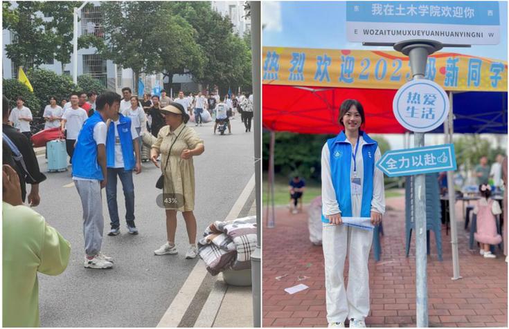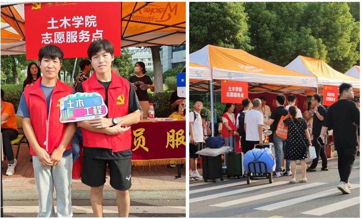 校门口及南大门志愿服务站负责运输行李和引导新生至报到点;九月桥报到点负责发放新生手册、住宿卡等物品,帮助新同学将行李送至宿舍;11栋行李暂存处负责女生行李的暂存和搬运。校园内各地也都安排了志愿者轮值,随时给新生提供帮助,确保哪里有需要,哪里就有学院志愿者的身影。 党员先锋 保驾护航 为充分发挥党员的先锋模范引领作用,迎新当天,学院各学生党支部开展了“喜迎新生 党员先行”志愿服务活动。党员志愿者们不仅贴心地给新生介绍校园环境,还会提醒新生谨防开学初期常见的电信诈骗骗局,让每一位新生第一时间感受到学校和学院的关怀。每一年的迎新现场都能看到土木党员志愿者的身影,变的是迎新的面孔,不变的是服务群众的初心。