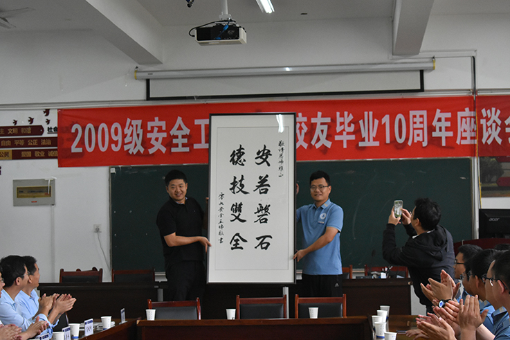 捐赠仪式后,与会人员召开座谈会。卢平对校友们的返校表示欢迎并讲话。他指出,安全工程专业适用范围广,与居民生活息息相关,未来必将前途光明。当前青春正好,奋斗正当时,他希望校友们将自己的工作方向与国家发展相结合,行而不辍,不断推动国家经济建设和社会发展。曹佰来向校友们介绍了校友会和教育发展基金会的发展情况。施国栋从专业设置、教育教学、科学研究等方面向校友介绍了土木工程学院的发展和进步。 与会校友依次做了自我介绍,细数回忆了在母校的求学经历,感激母校的悉心培育;介绍了毕业后的工作和生活情况以及获得的成绩。感谢校友会、学院教师和筹备组同学的辛苦付出并向土木工程学院捐赠了书画《安若磐石,德技双全》。“安如磐石,德技双全”以“安”开头、以“全”结尾,善始善终。祝愿所有校友身体安如磐石,工作德技双全,安如磐石更是对母校蓬勃发展的美好祝愿。