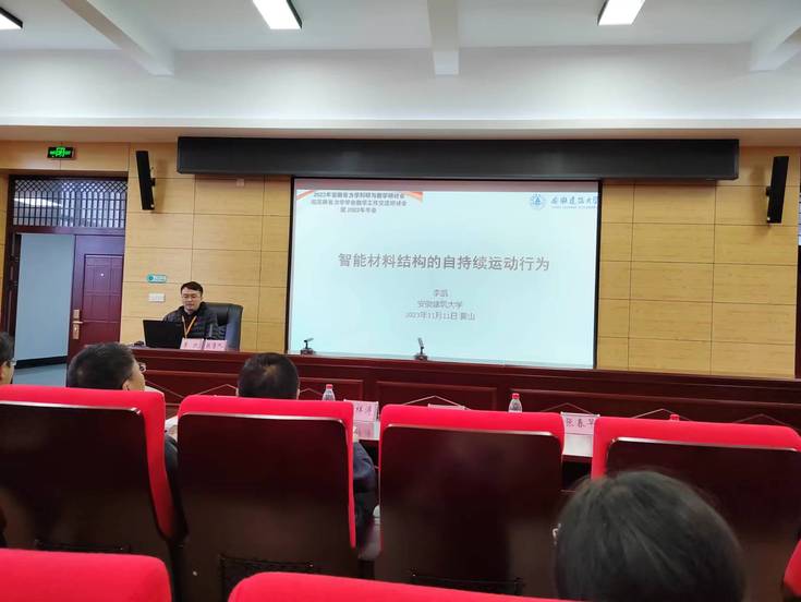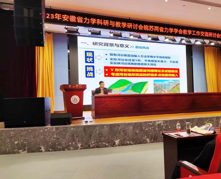 本次研讨会上,我校两位教授受邀进行了交流报告。张宁教授做了“V形河谷地震波动理论及工程应用”特邀报告,主要介绍了V形河谷场地地震波动理论,分享了大型振动台波动试验对河谷地形效应的研究成果及其在河谷桥梁工程方面的应用,并简要介绍了土木学院的发展历程和目前取得的成果;李凯教授则做了关于“智能材料结构的自持续运动行为”的邀请报告,重点介绍了智能材料结构的自持续运动特性,研究成果对于材料科学和工程应用具有重要意义,并获评为大会优秀报告。