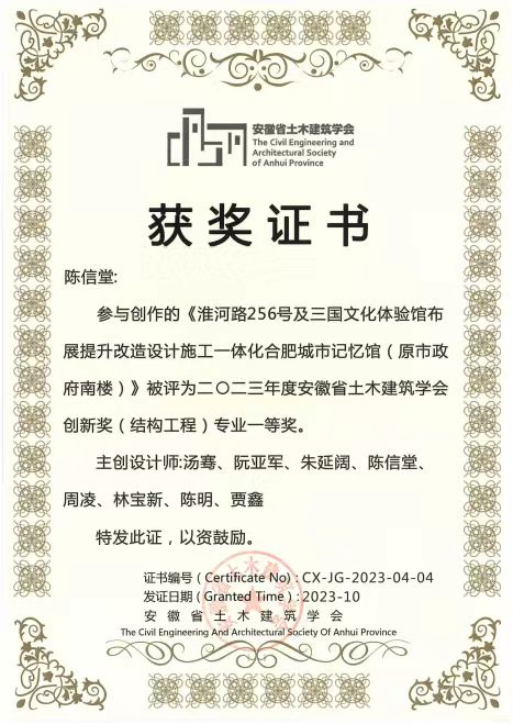 本网讯 近日,土木学院陈信堂老师的项目“淮河路256号及三国文化体验馆布展提升改造设计施工一体化合肥城市记忆馆(原市政府南楼)”荣获2023年度安徽省土木建筑学会创新奖(结构工程)专业一等奖。