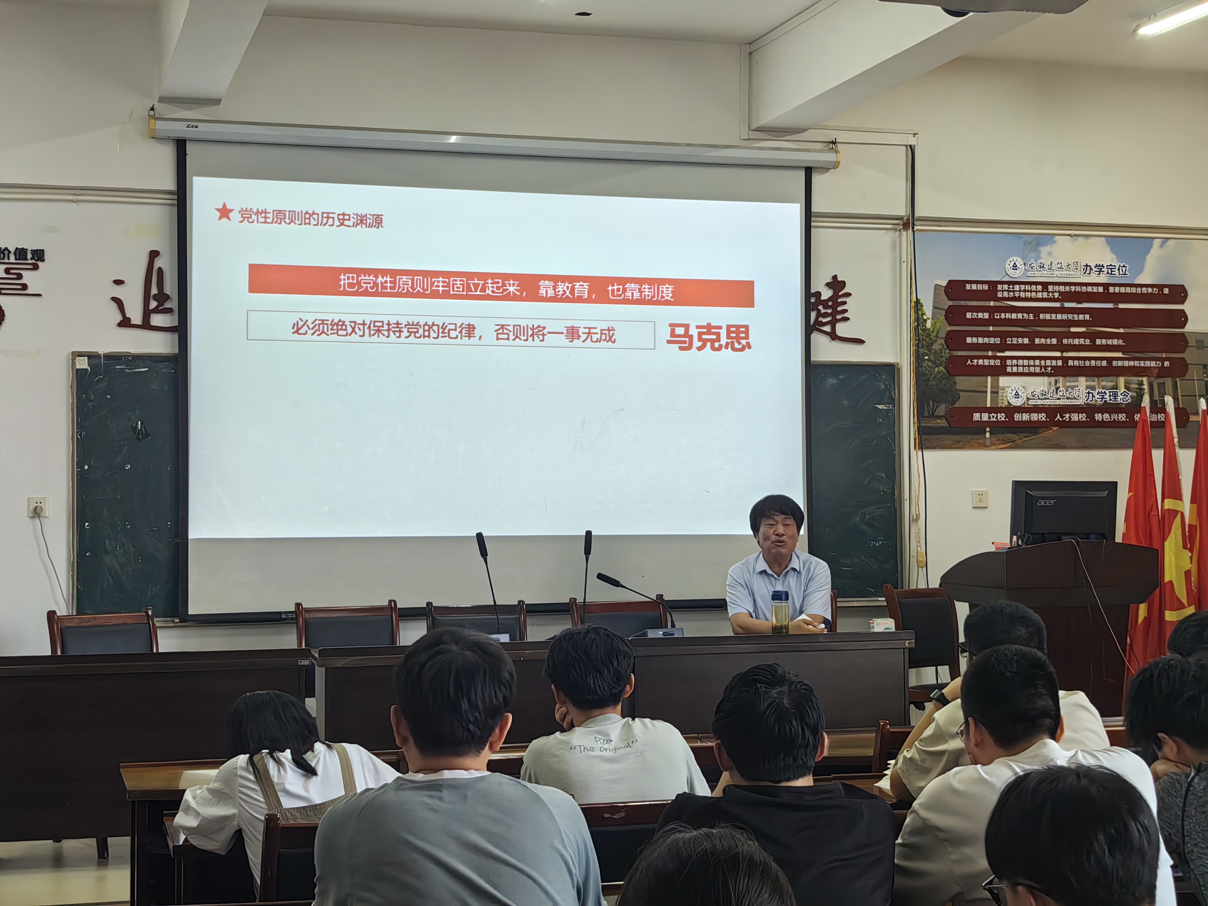 吴德义以“坚持党性原则,涵养清风正气”为题,从党性原则的历史渊源、党性原则的基本内涵、加强党性修养是共产党员的终身课题三个方面讲解了坚持党性原则的重要性。他从历史发展的角度进行分析,党历来高度重视加强党员的党性修养,加强党性修养也是巩固党的执政基础。并结合当代大学生实际情况,引导全体学生党员在党纪学习教育过程中要自觉学思践悟、磨砺党性,牢记自己是有着特殊政治使命、受到严格组织约束的公民,入了党就意味着主动放弃一部分普通公民享有的权利和自由,就要在政治上讲忠诚、组织上讲服从、行动上讲纪律。