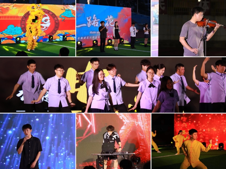 落日西沉、晚星渐明。开场舞狮《盛世欢腾》自由轻快,用扣人心弦的节奏开启晚会的欢乐氛围。武术《拳光剑影》热情四射、舞蹈《小城夏天》节奏欢快,点燃全场热情;《淋雨一直走》、《起风了》、《向阳而生》等歌曲引发在场同学的强烈共鸣,大家挥舞着荧光棒齐声合唱,跟着音乐一起诉说着离别的不舍。