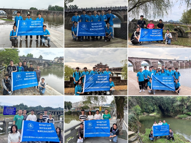 在走访鉴定危房的间隙,团队成员们参观了梅山水库及金寨县烈士纪念馆,感受伟大工匠精神和红色革命精神。老旧小区的低吟与红色基因的高歌交织成一首悠扬的田园诗,团队成员表示要为乡村振兴和红色传承贡献更多的力量。 探寻徽桥密码,解构徽韵文化 徽州遗产古桥修护现状调研团队深入黄山三区四县,开展徽州地区古桥保护现状调研,探寻徽桥密码,解构徽韵文化。用实际行动奉献青春力量,用所学知识服务乡村振兴,让青春之花绽放在祖国最需要的地方。