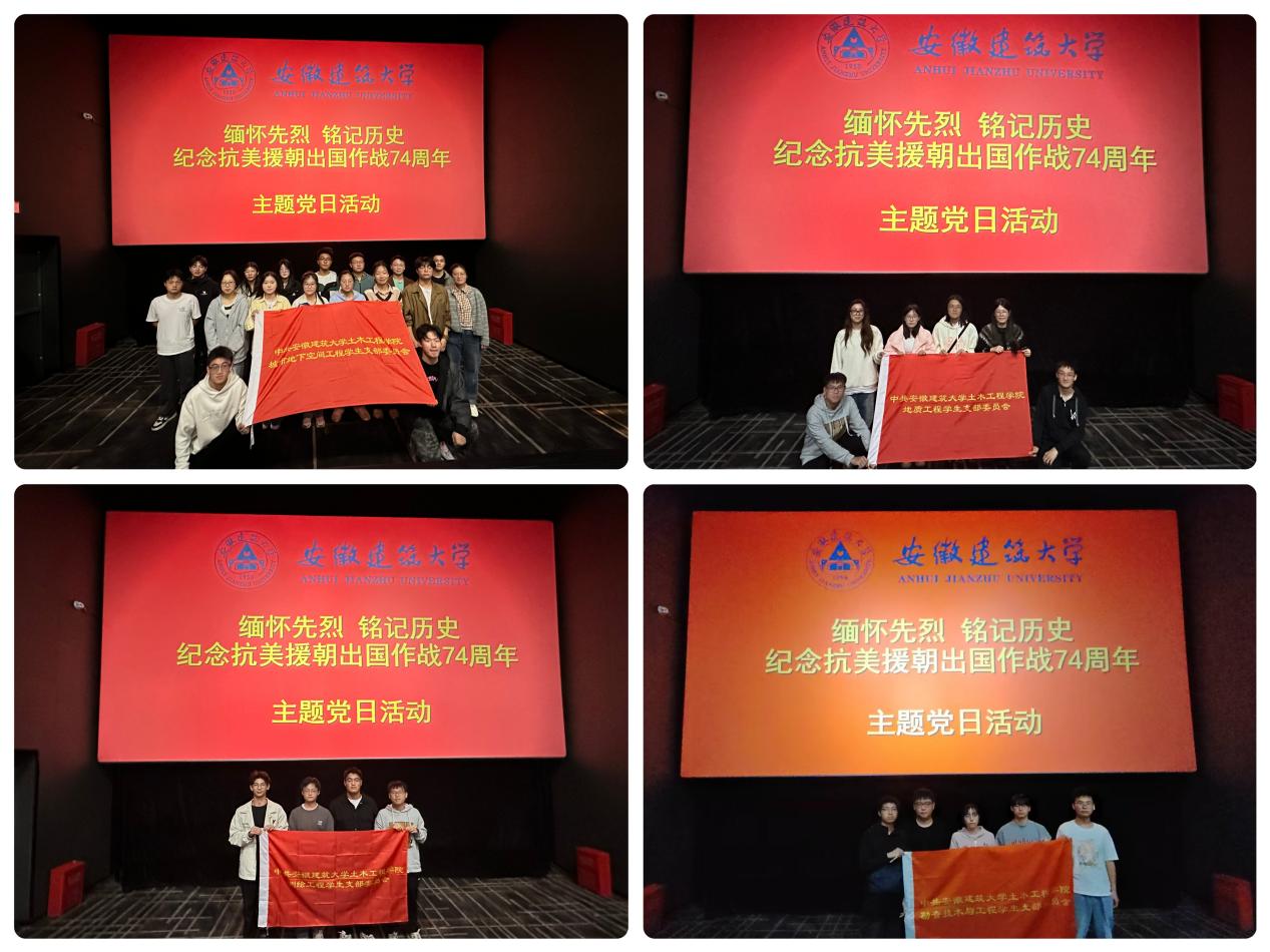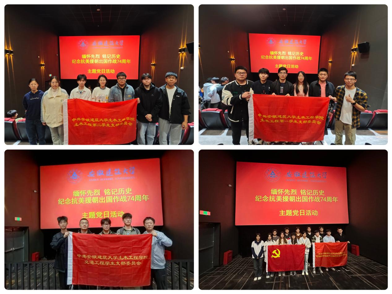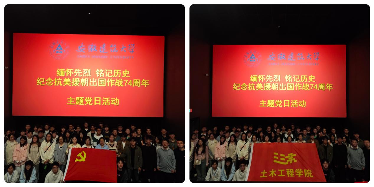 本网讯  20241025中国人民志愿军抗美援朝出国作战74周年纪念日,为铭记抗美援朝战争的伟大历史意义,弘扬抗美援朝精神,激励青年学子为实现中华民族伟大复兴的中国梦而不懈奋斗。土木工程学院学生党支部联合开展了“缅怀先烈、铭记历史”红色观影主题党日活动,组织党员观看《志愿军:存亡之战》,回顾抗美援朝峥嵘岁月,缅怀革命先烈,传承红色基因,凝聚奋进力量。
