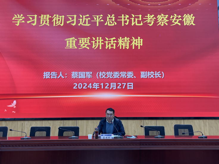 蔡国军指出,习近平总书记考察安徽重要讲话精神意义重大、内涵丰富,具有极强的政治性、思想性、指导性和针对性,为做好当前和今后一个时期的各项工作指明了前进方向、提供了根本遵循,要深刻认识习近平总书记考察安徽的重大政治意义、战略意义、理论意义、实践意义,自觉把思想和行动统一到习近平总书记重要讲话精神上来,坚定拥护“两个确立”、坚决做到“两个维护”,增强历史主动,勇担时代重任,奋力推进学校高质量发展。