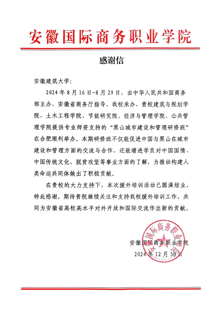 本网讯  近日,学校收到了一封来自安徽国际商务职业学院的来信,对土木学院在“黑山城市建设和管理研修班”中提供专业支持和无私帮助的表达了诚挚谢意。
