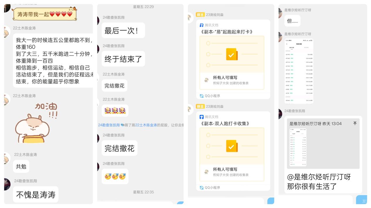 打卡群内,易班工作站工作人员定期推送运动知识、励志语录,增强参与者粘性;同学们也在打卡群中分享跑步心得、照片,互相鼓励,形成了良好的运动氛围。经过一个月的坚持与努力,数百名同学成功完成了打卡任务。
