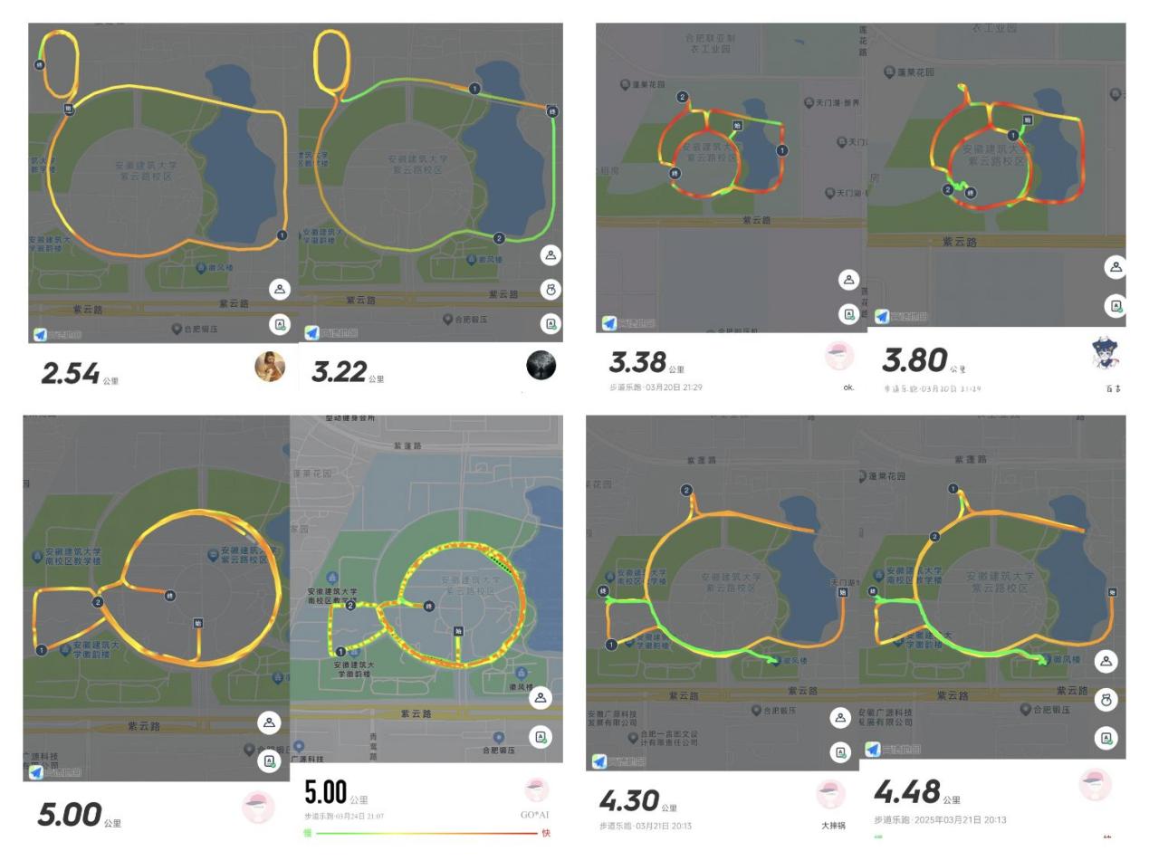 活动设置单人跑和双人跑,参与者们热情高涨,无论是清晨的操场还是夜晚的林荫道,都能看到他们奔跑的身影。他们或结伴而行,或独自奔跑,彩色的路线图勾勒出双脚丈量过的校园,渐渐提高的速度展现了逐渐增强的体质,额头流下的汗水滋养了旺盛的生命力。