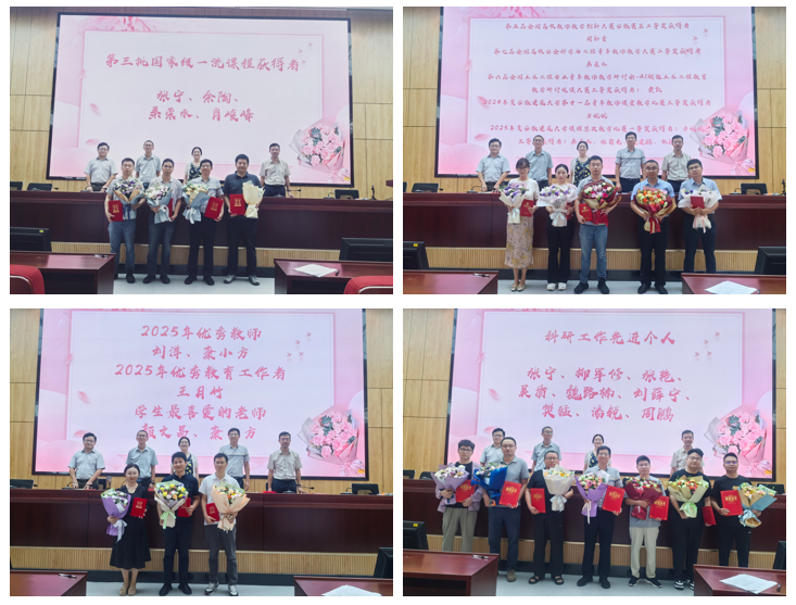 学院院长张宁宣读了《关于表彰2025年度优秀教师、优秀教育工作者、学生最喜爱的老师的决定》、《关于表彰2024-2025年度科研先进个人相关事宜的决定》,第三批国家级一流课程获得者以及本年度参加校内外教学比赛获奖教师。学院党政领导班子为获表彰教师颁发证书并献上花束。