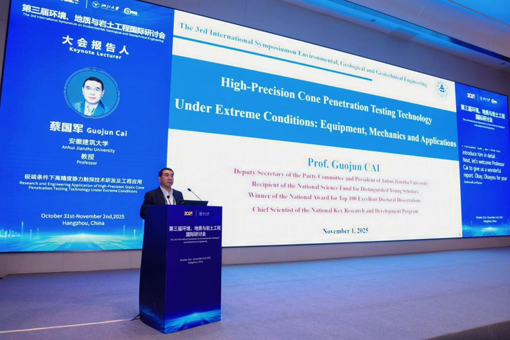 蔡国军教授受邀做“High-Precision Cone Penetration Testing Technology Under Extreme Conditions”大会特邀报告,主要阐述了极端条件下静力触探的贯入理论与技术体系、高精度装备研发、数据智能解译与可靠度评价等,相关工作得到了与会专家学者的高度评价,并与现场多位国内外专家学者进行了深入的交流。