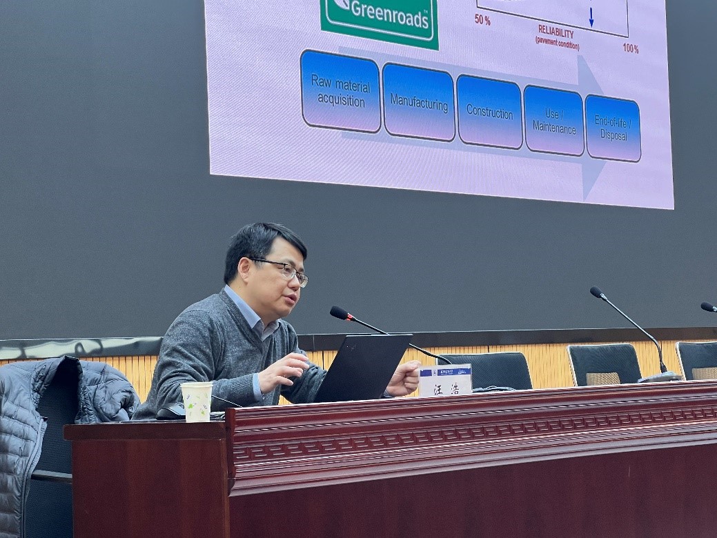 汪浩教授从建筑材料、结构设计、回收材料、运营维护策略和能量收集等多个方面进行了专业介绍,就如何推进道路生命周期的可持续性和碳减排方面给出专业方案样例,道路基础设施在促进了经济和社会发展的同时,所造成的能源消耗和温室气体排放,对建立可持续化世界的愿景提出了挑战。本次报告会也为我校师生在研究工程领域的低碳化以减缓气候变化给予了新的启发。