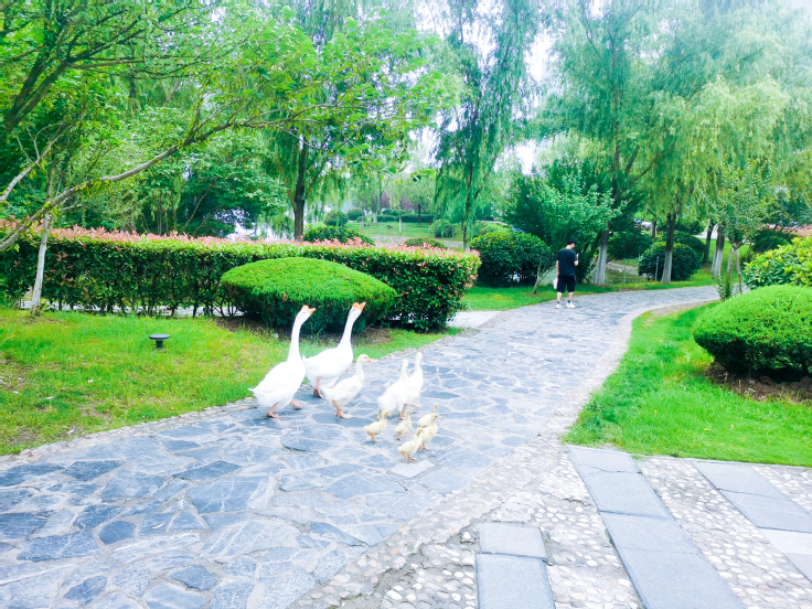 雨后初晴,惠风和畅。在“鹅爸鹅妈”的带领下,大白鹅一家来到湖边遛弯,悠然自得、其乐融融。