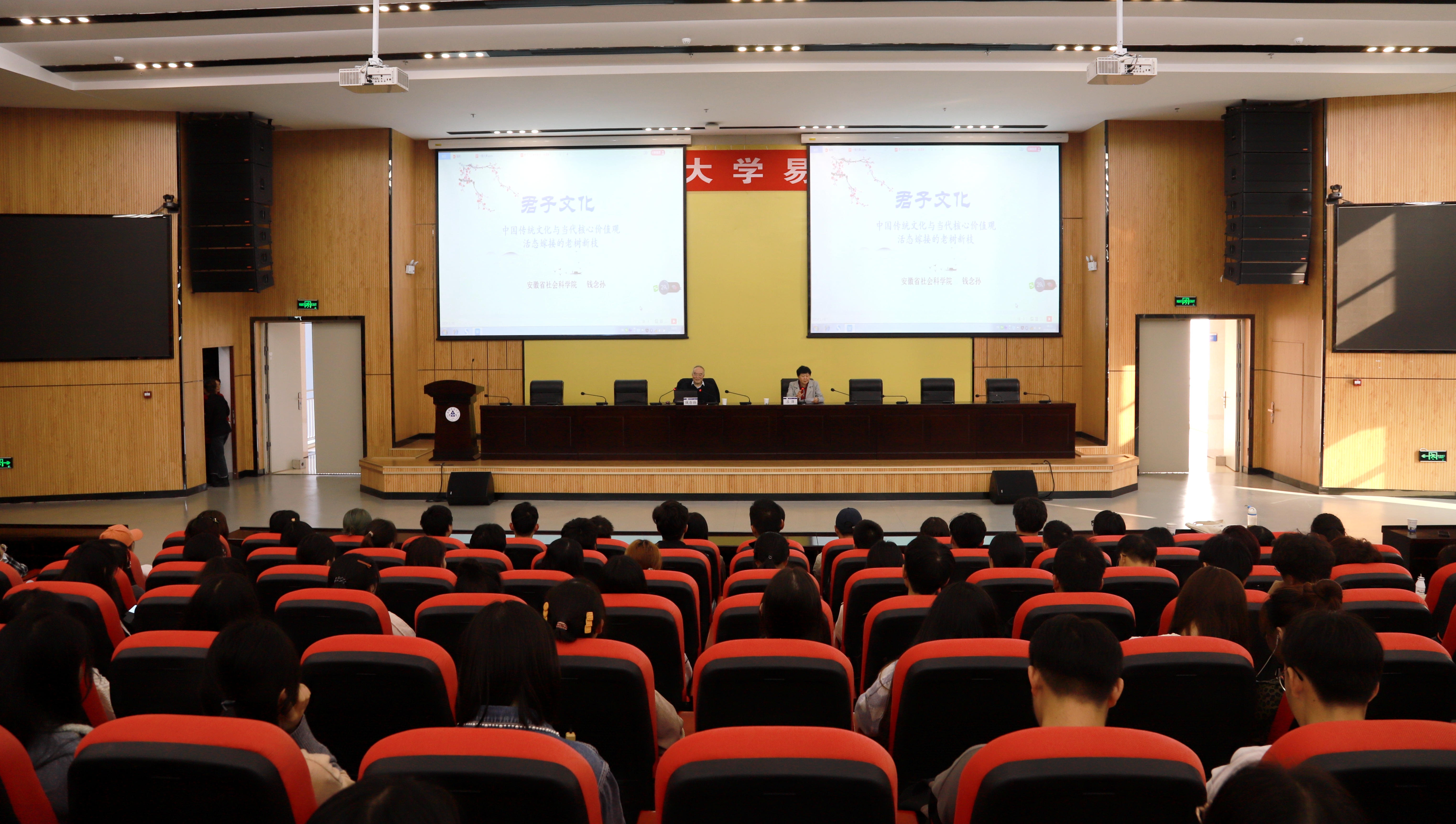 本网讯  1118,安徽省社会科学院研究员、省文史馆馆员钱念孙做客易海大讲堂,在南区实验综合楼二楼报告厅作题为《君子文化——中国传统文化与当代核心价值观活态嫁接的老树新枝》的学术报告。报告会由校党委副书记吕萍主持,艺术学院、公管学院、大学生记者团共300余名师生聆听报告。