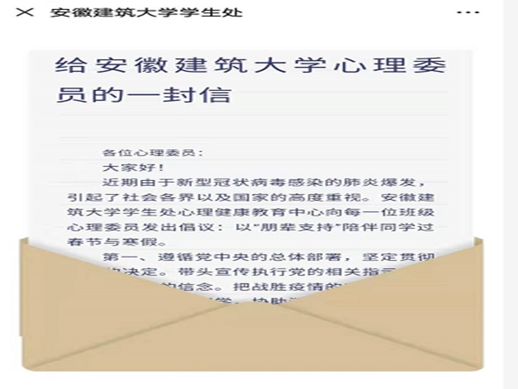 新型冠状病毒感染的肺炎爆发初期,学校向每一位班级心理委员发出倡议:以“朋辈支持”陪伴同学过春节与寒假,号召全校班级心理委员遵循党中央的总体部署,坚定贯彻中央的各项决定;以科学为准绳,不信谣、不传谣,切实维护自身健康,适时开展同伴支持;在做好自我身心调适的同时,利用所学专业知识为有需要的同学提供心理健康支持,开展“倾听、心理陪伴与转介”的同伴支持工作,使每一位同学以最佳心态度过当前特殊时期。