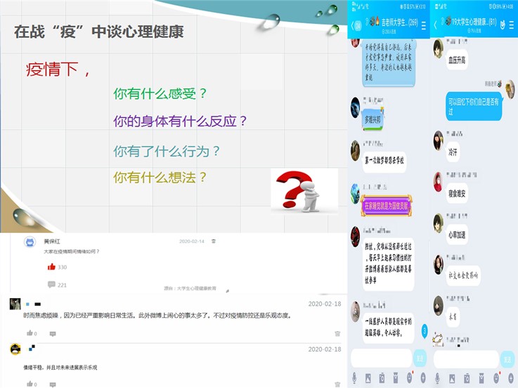在这场突如其来的疫情面前,学生会出现各种情绪反应,上课时老师通过提问,互动,让听课学生充分自在地表达自己在疫情期间的情绪状态。学生在直播间通过文字或者语音的形式,讲述了自己从一开始的担心紧张到后来的积极面对,从分享中,我们也了解到大多数学生的情绪比较理性平和,对战胜疫情充满信心。