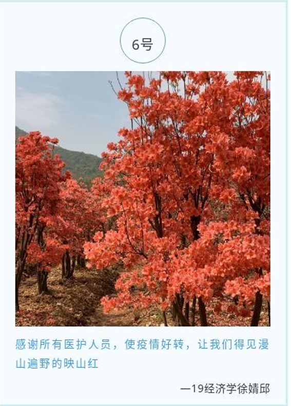 同学们积极参加,用语言表达对广大医护人员的感谢与敬佩并用相机记录下疫情期间那些温暖的瞬间,描绘出白衣天使的巨大贡献与无私,表达了对于他们的敬意。“在恐慌中挺身而出,不计后果,义无反顾,用生命换世界一片安宁与光明”是对奋战一线的白衣天使们最完美的写照。