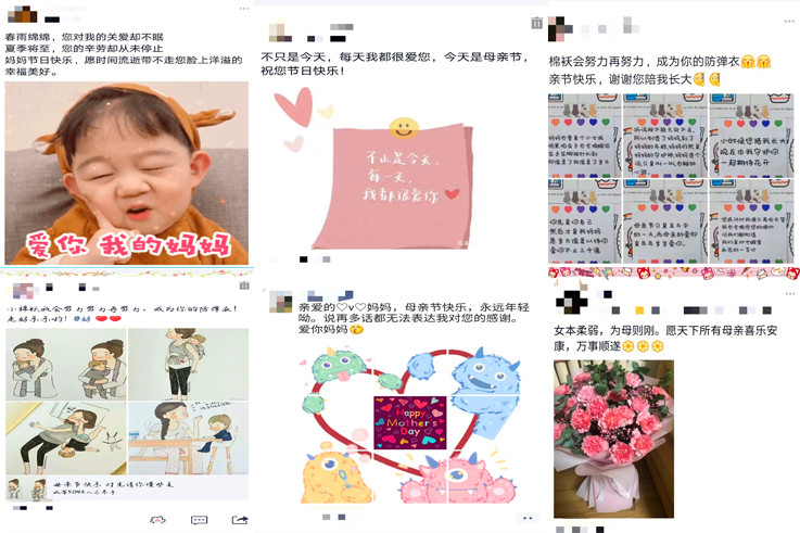 本次活动号召学生在5月10日当天发送一条关于母亲节寄语的说说或者朋友圈,表达自己内心真实感受以及对母亲的感恩。活动吸引了材化学子广泛参与。同学们纷纷在朋友群和空间向母亲“表白”,表达了对母亲的爱意和敬意。有人分享了与母亲的感人小故事,有人晒出帮助妈妈做家务的照片,也有人编写诗词吐露自己的心声。